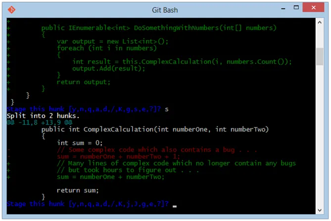 status- this gives a succint description of what is staged/unstaged per fileupdate- stage files tracked by Git.revert- unstage file(s)add untracked- stages an untracked filepatch- stage only part of a file (e.g if you have changed multiple functions but want to stage changes in different commits) - once you select a file, it will go through it chunk by chunk and offer you a set of commandsStage this hunk[y,n,q,a,d,j,J,g,/,e,?]?- typing?lets you see what each command does.diff- shows a list of staged files and lets you see staged diff per file.quit- exit shellhelp- get a quick overview of what each command does. A*next to a file means its status will be changed by the command (staged/unstaged depending on if updating/reverting). Pressing Enter after typing nothing in any of the command sub-menus will stage/unstage any files.