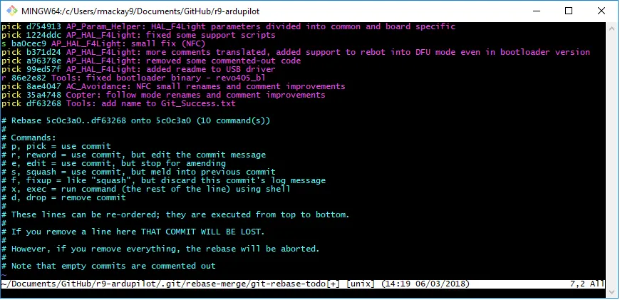 To gain finer control over your commit history in your local branch git rebase -i HEAD~n opens an interactive shell for rebasing a set of the last n commits listed from oldest to newest (i.e. the order in which they will be rebased)- it allows you to “modify history”, but note the original commits can’t be modified, only rebased.