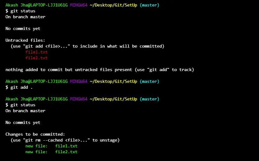 We can use the -s option for git status to get a cleaner (one line per file) output. This displays ?? if a file is not tracked, red if modified and green if staged.