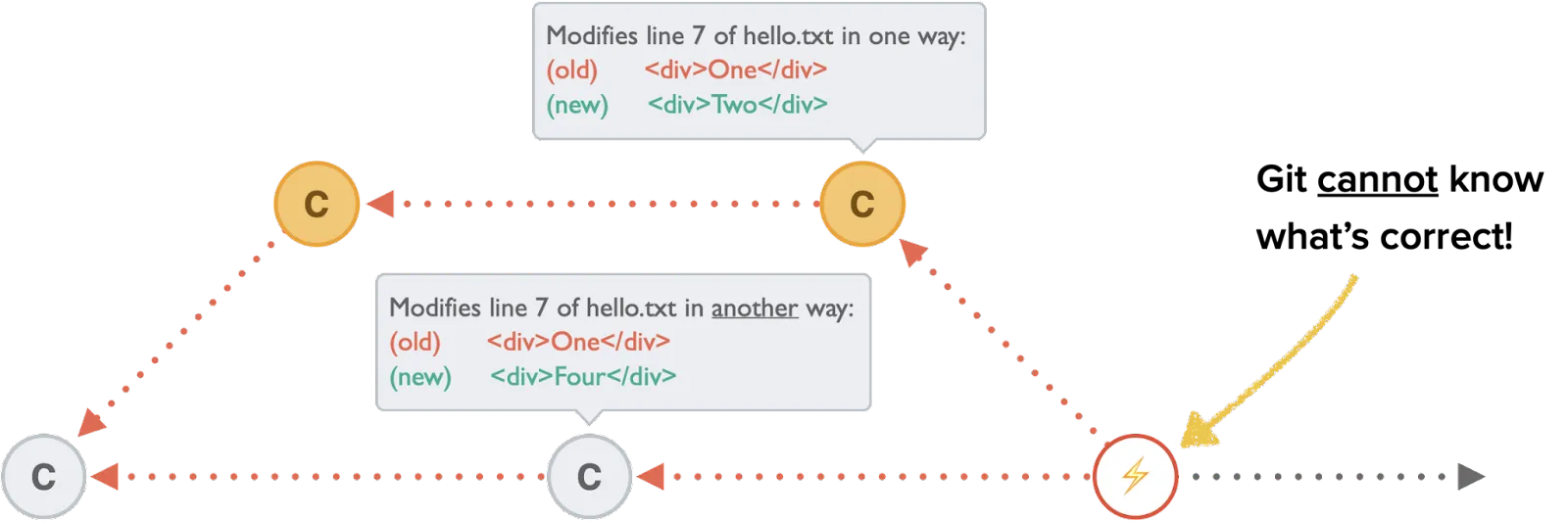 If both branches alter the same part of a file then we have a merge conflict - this is where Git doesn’t know which version to keep, so you have to resolve it yourself. To see which files have a conflicting update you can run git status.