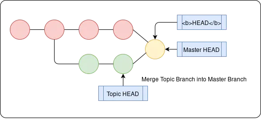 Merging involves creating a new merge commit - this is based off a common ancestor commit of the two branches, and it points to both HEADs of branches as its previous commits. We do this by switching to the base branch, and then run git merge