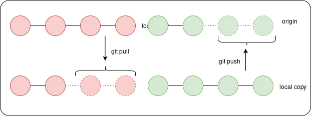 This is all well and good if each of the individual developers is working at different times. The diagrams above showed push/pull where only the origin changed, or the local copy changed, not when multiple people are working.