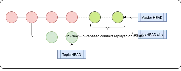 Rather than combine the two branches with a merge commit, rebasing instead replays the commits of the topic branch as a series of new commits on top of the base branch, resulting in a cleaner serial history.